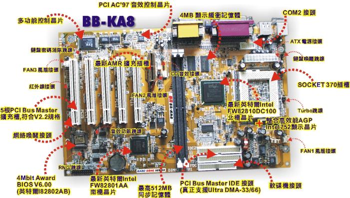 華昇BB-KA8 Socket370 Intel810 150MHz ATX主機板功能說明: