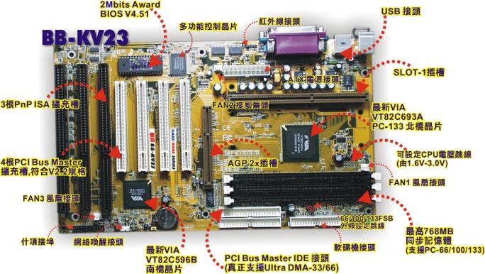 華昇BB-KV23 Slot-1 VIA693A PC-133 150MHz ATX主機板功能說明: